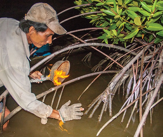 Thuyền rẽ rừng đước, càng vào sâu càng nhiều ba khía bò đến độ kích thích đám thanh niên nhảy bừa xuống bùn để truy bắt tạo nên những trận cười không dứt. Chiến lợi phẩm của chuyến soi đêm kéo dài hai giờ là một xô đầy ba khía đủ để chúng tôi chế biến được ba món: rang muối hột, rang me và nướng chấm muối ớt.